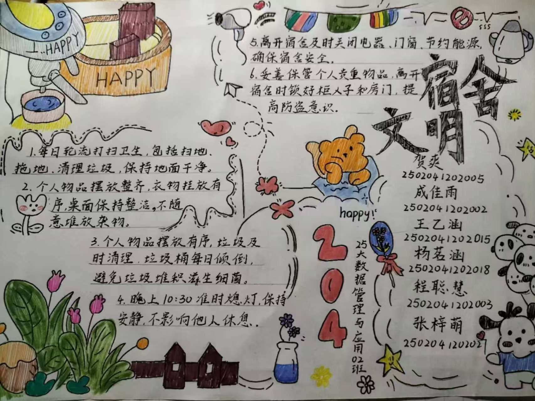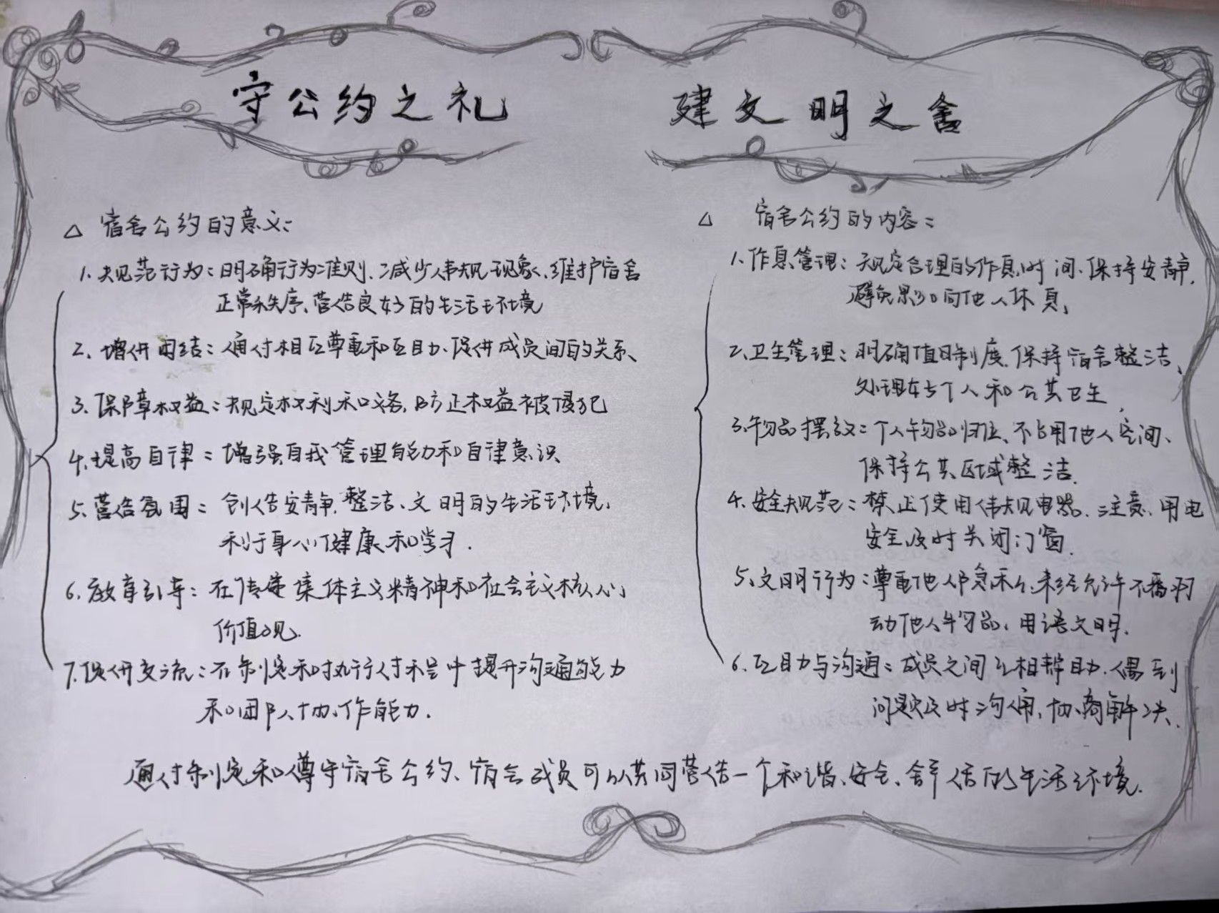 本次活动旨在通过宿舍成员共同商讨、制定适合本宿舍的行为规范,明确作息时间、卫生值日、物品摆放及公共物品使用等方面的要求,进一步增进室友之间的沟通与理解,促进彼此包容,化解潜在矛盾,营造融洽和睦的生活氛围。活动期间,各宿舍成员踊跃参与,积极发表意见,共同拟定具有宿舍特色、务实可行的文明公约。许多宿舍不仅制定了文字公约,还配套设计了值日表、公约签名墙等,增强了执行的仪式感和约束力。这一过程不仅深化了同学们对集体生活的认同,也锻炼了沟通协调与团队合作能力。