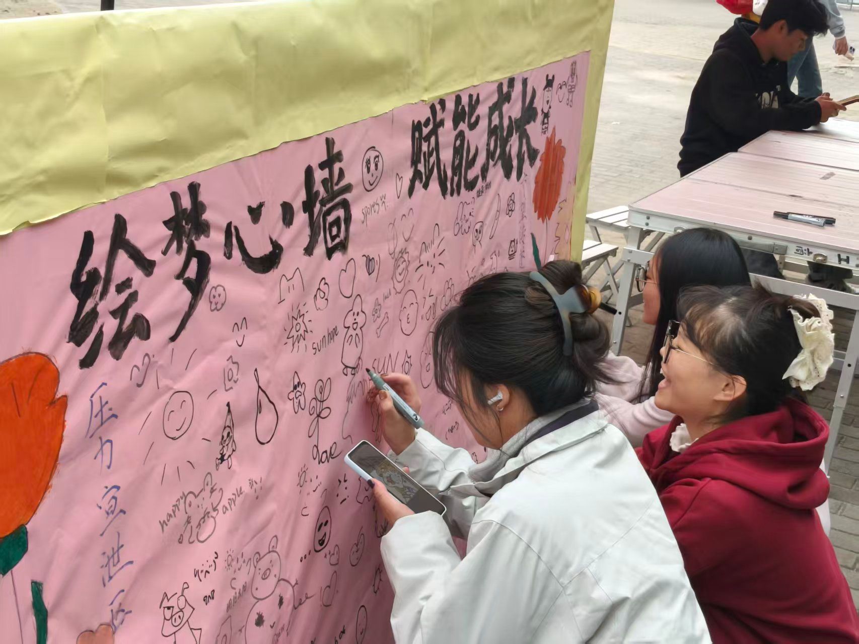 活动过程中,同学们纷纷拿起彩笔,在涂鸦墙上尽情挥洒。在“压力宣泄区”,大家画出乌云、枯花、哭脸等表情,形象地展现了内心的沉重感。随着同学们的不断创作,涂鸦墙上逐渐被各种代表压力的图案和文字填满,仿佛是一个个烦恼的集合地。而在“希望传递区”,氛围则截然不同。同学们用明亮的色彩勾勒出太阳、彩虹、笑脸等充满希望的图案,并写下对未来的美好期待。这些充满正能量的图案和文字,如同温暖的阳光,照亮了每一个人的心灵。随着时间的推移,涂鸦墙上的作品越来越多,每一幅画、每一句话都承载着同学们的喜怒哀乐,让这份独特的记忆得以长久留存。