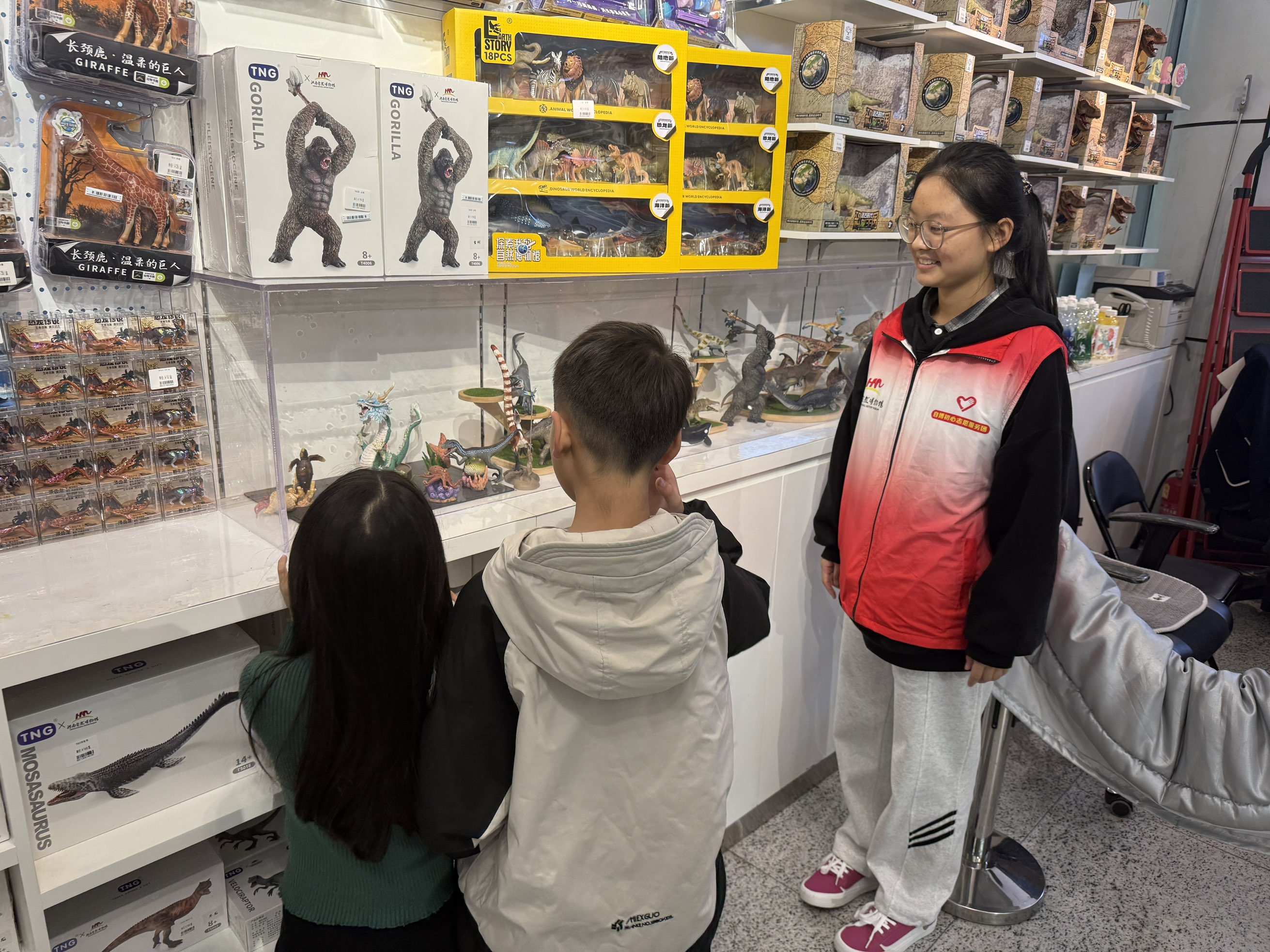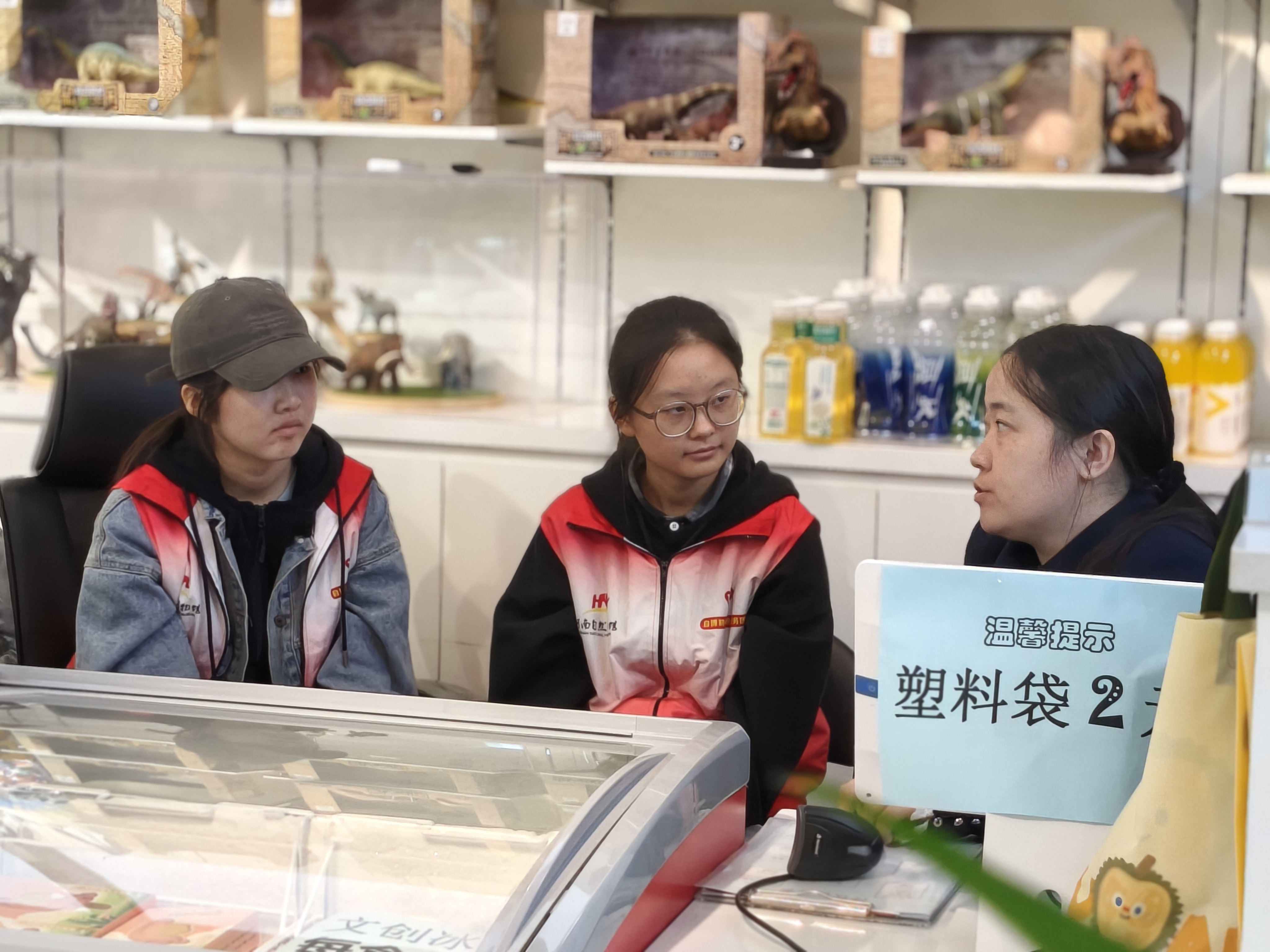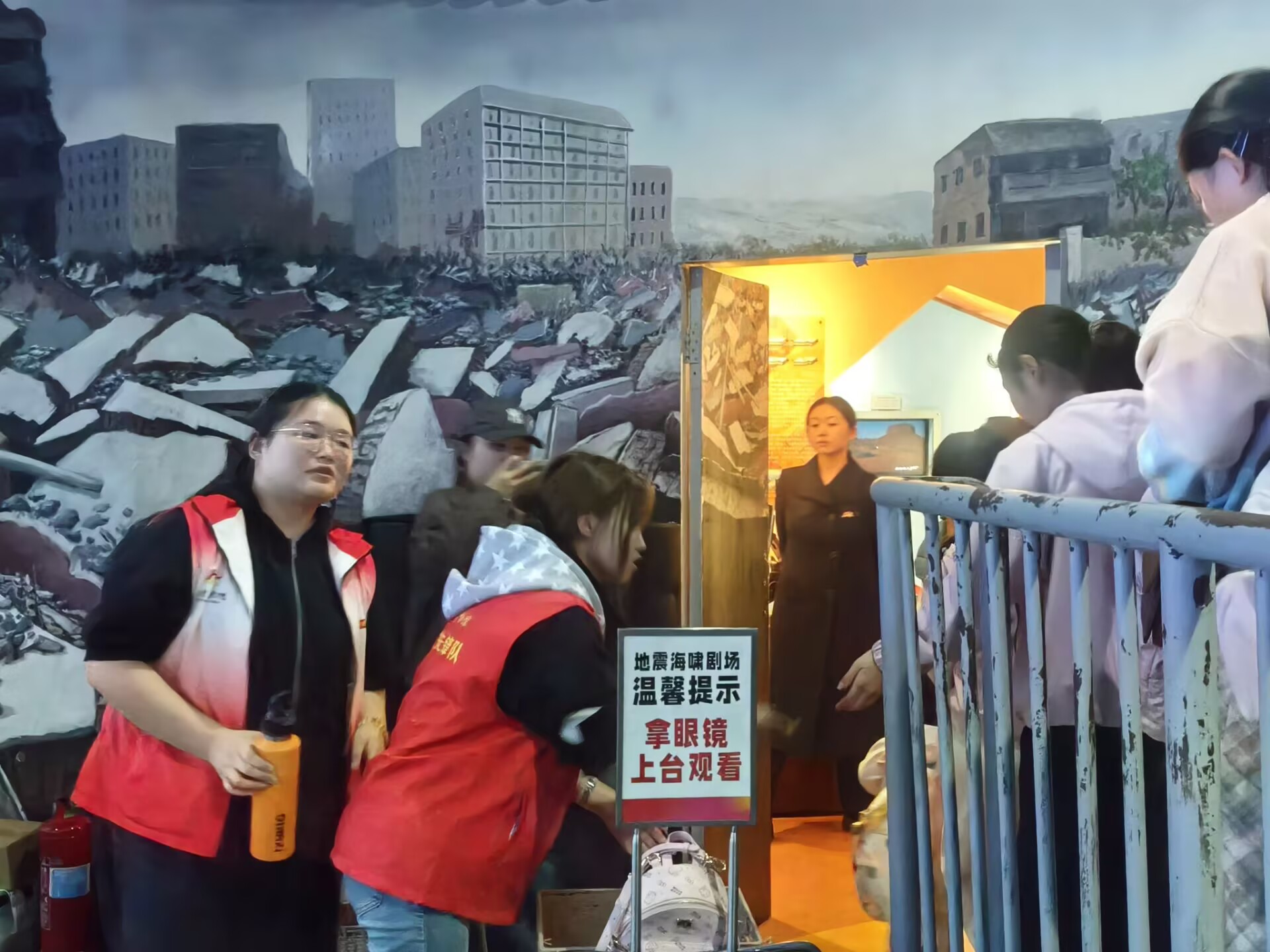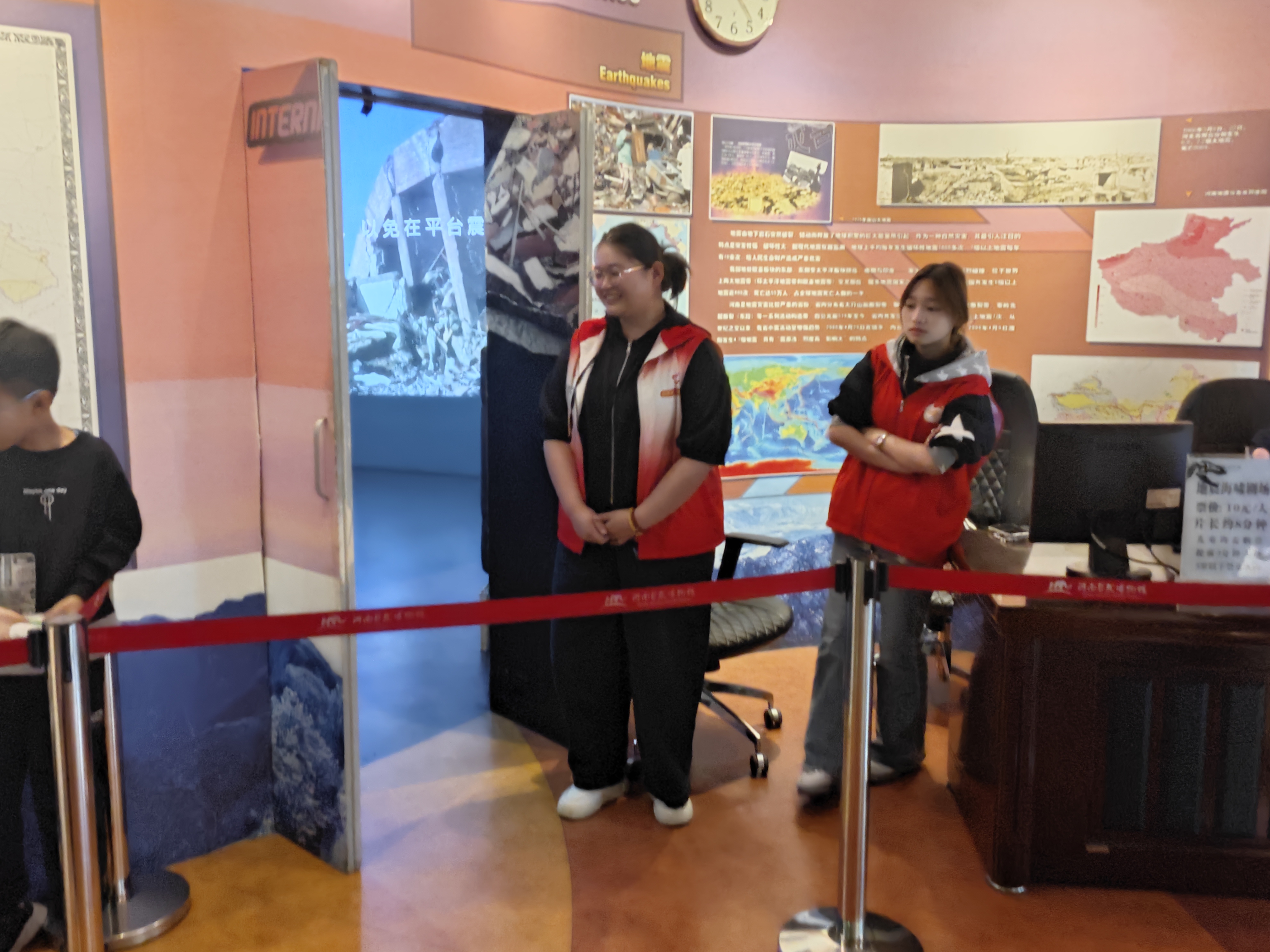 活动当天,志愿者们身着统一的红色马甲,以饱满的热情投入服务工作,根据博物馆需求有序分布在四大核心岗位。在4D影院岗位,志愿者协助工作人员引导观众有序入场、讲解观影注意事项,保障观影体验;在服务台岗位,他们耐心为游客解答展区分布、参观路线等问题,提供咨询指引服务;在地震海啸科普展区,志愿者配合讲解员维护参观秩序,协助游客体验互动设备,助力科普知识传播;在文创销售区,他们主动协助工作人员整理商品、引导消费,展现出良好的沟通能力与服务意识。参与活动的学生表示,此次志愿服务不仅让自己近距离感受了自然科学的魅力,更在实践中学会了倾听与协作,深刻体会到“奉献、友爱、互助、进步”的志愿精神,为今后融入社会、服务社会积累了宝贵经验。