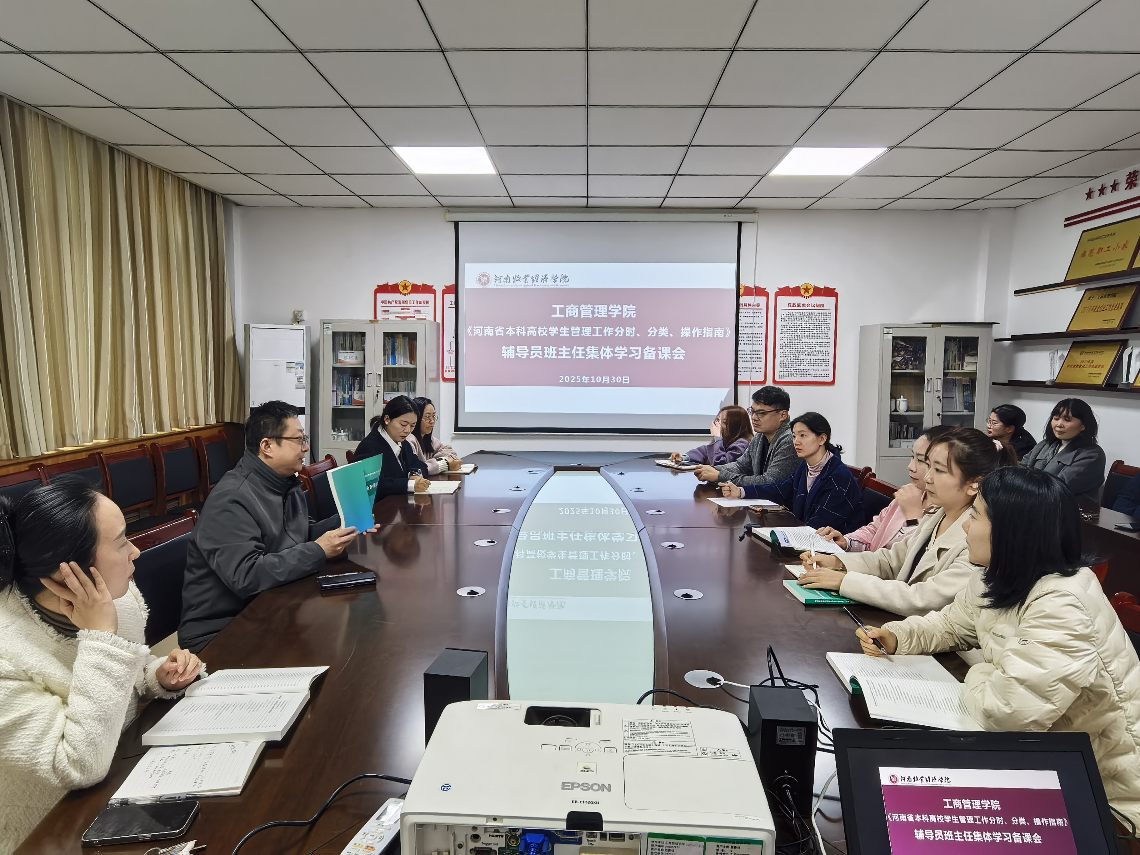 为深入贯彻落实新时代高校学生工作要求,提升辅导员队伍专业化水平和提高班主任服务学生自觉性,2025年10月30日下午,工商管理学院召开《河南省本科高校学生管理工作分时、分类操作指南》(以下简称《指南》)集体备课会。学院全体辅导员、班主任参会,会议由学院党委副书记詹珅主持。
