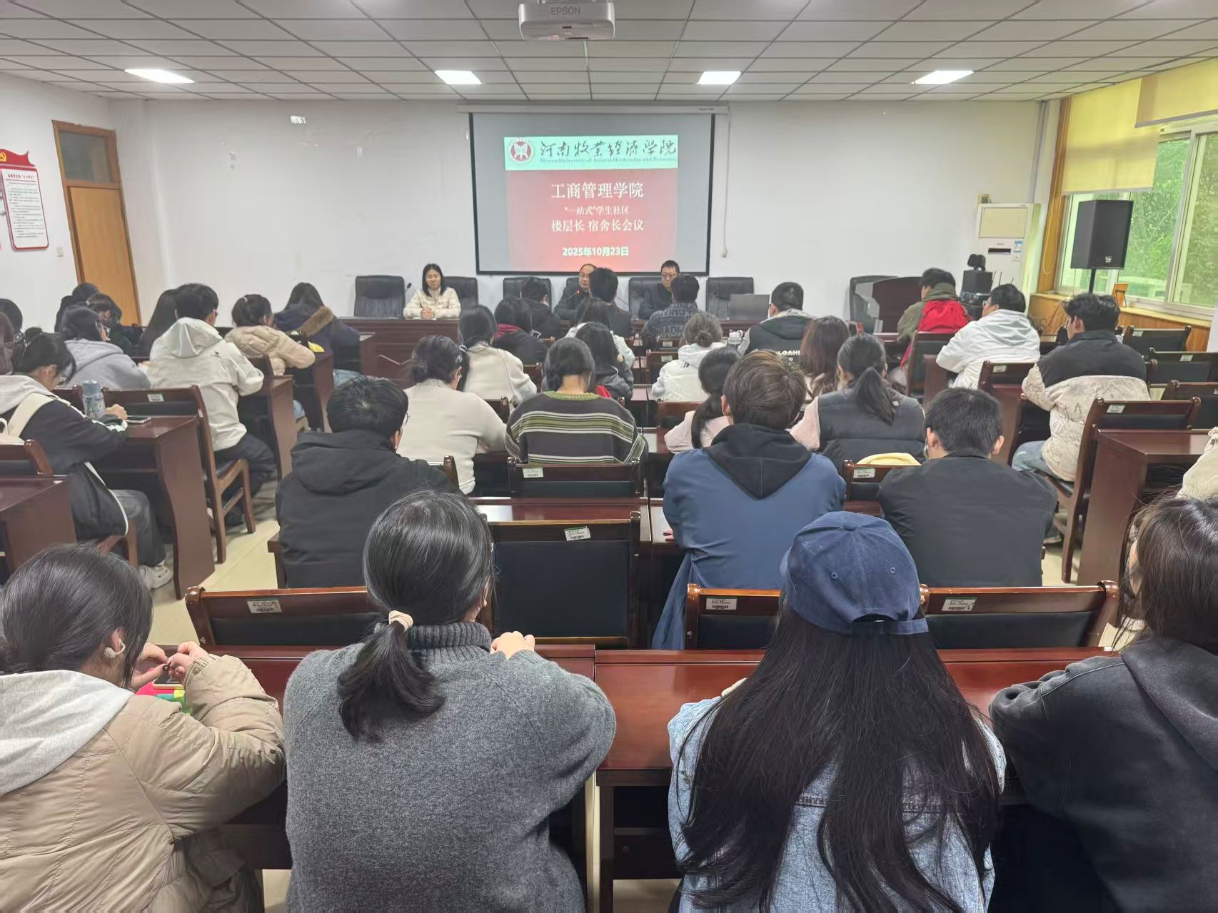 为进一步加强学生楼层长队伍建设,提升我院“一站式”学生社区的教育、管理和服务水平,深化新学期学生安全与美好社区建设,工商管理学院于2025年10月23日召开“一站式”学生社区楼层长、寝室长安全工作会议。院党委书记王国辉、党委副书记詹珅以及学院全体楼层长、宿舍长参加会议,会议由团委副书记周玉洁主持。