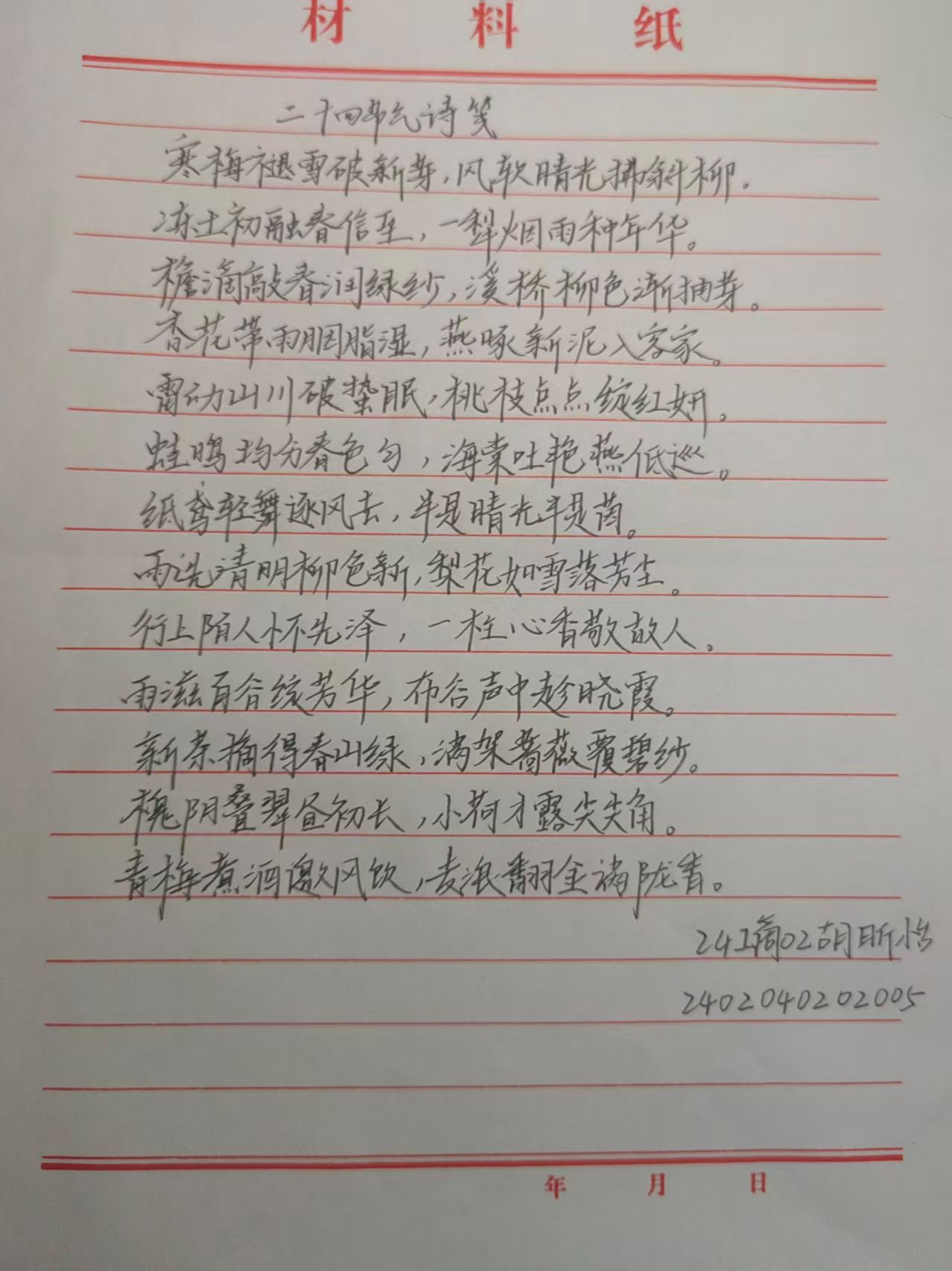 活动期间,同学们积极投入到冬季主题创作中。围绕“冬情”核心,以多元的创作形式表达对冬季的感知与思考,同学们用文字勾勒冬日景象、抒发内心情愫,通过创意设计赋予冬季文化新的呈现方式,将对季节的理解与热爱融入作品之中。在为期三天的活动里,创作热情持续升温,同学们在交流与探索中不断完善作品。收稿环节,同学们有序排队,将手写的诗稿递至工作人员手中,纸张上的字迹或娟秀或洒脱,都裹着对冬日与节气的感知。以古体诗勾勒“小雪檐边凝玉屑”的清冷景致,用现代诗抒发“雪落诗笺时,字里裹着冬的呼吸”的细腻情愫,一张张诗笺纸承载着各异的诗意。同学们彼此之间分享创作心得,交流创作思路,浓厚的文化氛围与青春活力弥漫在校园里,为冬日增添了别样暖意。