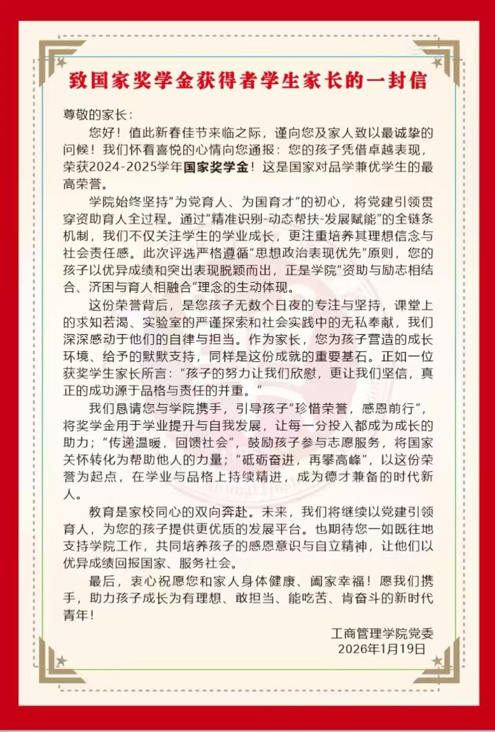 为深入贯彻落实立德树人根本任务,深化育人内涵、切实强化家校协同育人机制,近日,工商管理学院以院党委名义,向荣获2024-2025学年国家奖学金的学生家庭寄送贺信。