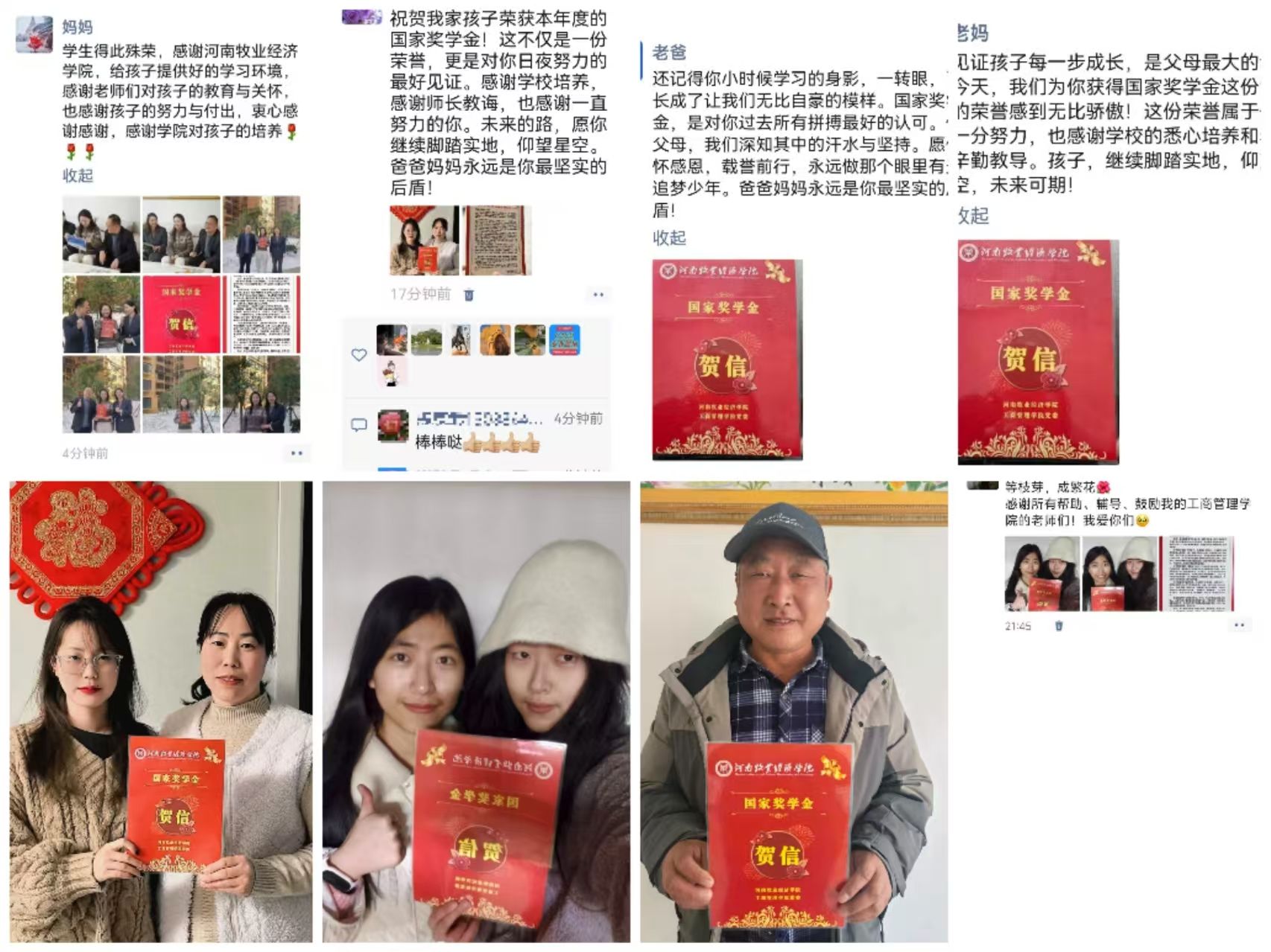 国家奖学金是高校学生荣誉体系中的最高奖项,既是对获奖学子过往勤勉笃行的充分肯定,更是对其未来成长发展的殷切期许。学院通过寄送贺信这一温情举措,将喜讯传递至千里之外,与家长共同分享学生成长成才的喜悦,让育人温度跨越山海、抵达千家万户。此举不仅生动体现了学院“资助+育人”深度融合的工作理念,也赢得了广大学生家长和社会各界的广泛赞誉。许多家长在收到贺信后,纷纷通过合影留念、微信转发、录制视频等方式晒出喜悦,真挚表达对学院用心育人的感谢与认可,“点赞”迅速刷屏朋友圈。