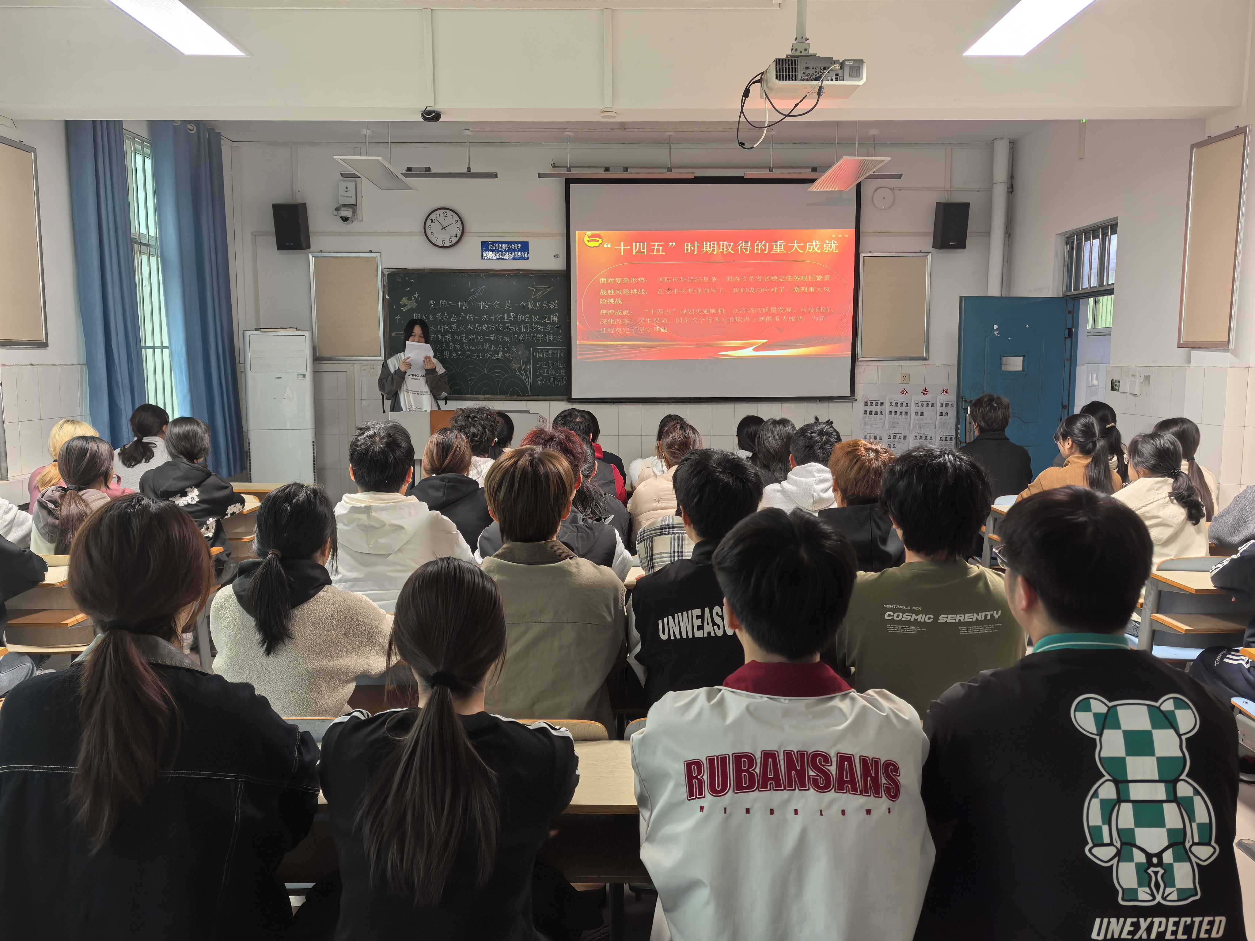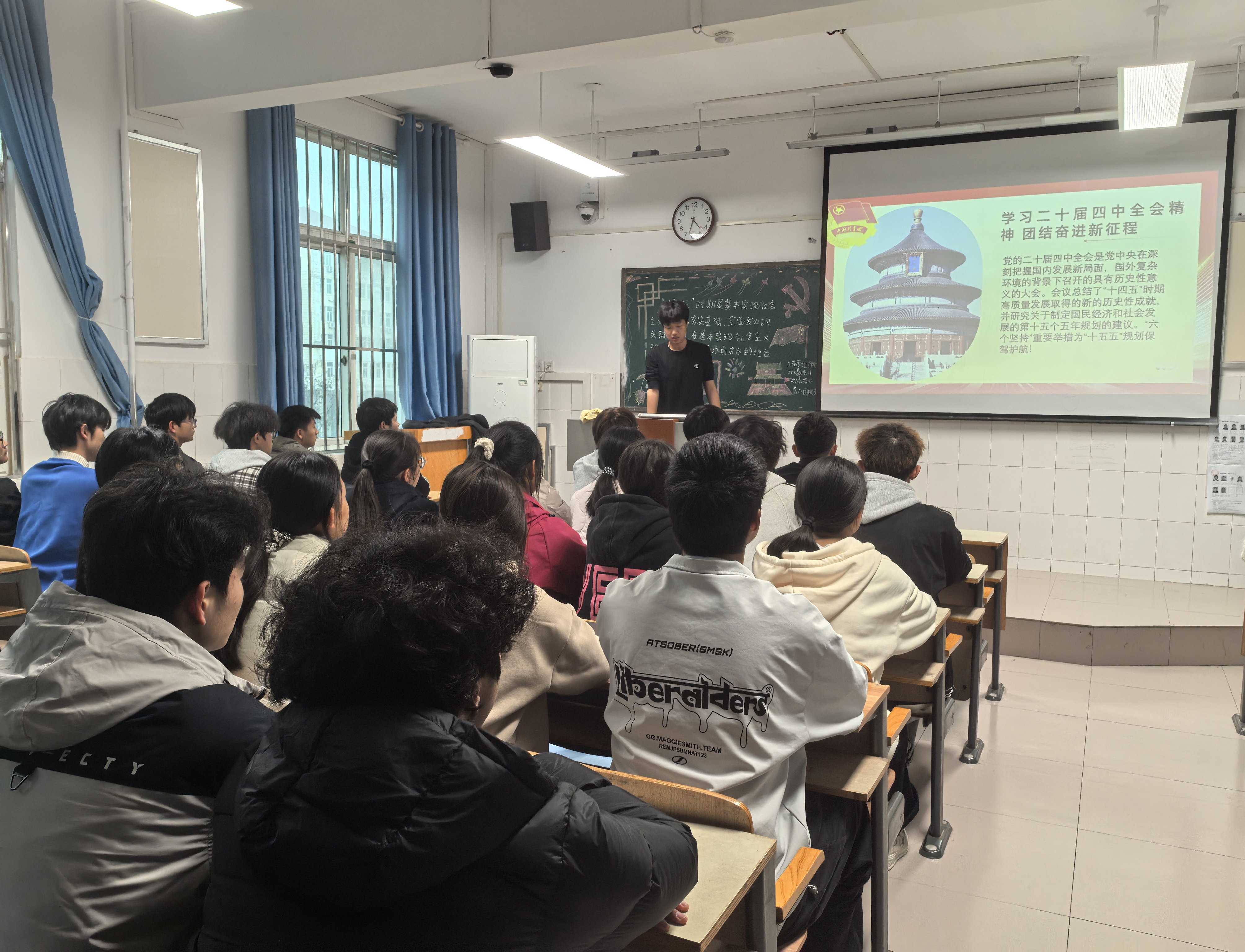 团课伊始,各班团支书围绕《党的二十届四中全会公报》及《党的二十届四中全会精神新闻发布会》相关内容展开系统讲解,详细阐释了全会的重大意义、核心要义与实践要求。团支书强调,党的二十届四中全会是在我国迈上全面建设社会主义现代化国家新征程、向第二个百年奋斗目标进军的关键时刻召开的一次重要会议,同学们要深刻认识到坚持党的全面领导是中国特色社会主义事业不断发展的根本保证。同时,团支书结合自身实践经历,用清晰的逻辑帮助同学们快速把握全会精神的精髓。随后,在互动交流环节,同学们围绕“青年如何贯彻落实全会精神”等问题展开热烈讨论。同学们纷纷表示,作为新时代大学生,要学深悟透全会精神,并将其转化为勤奋学习、服务社会、报效祖国的内在动力,以实际行动践行“请党放心,强国有我”的青春誓言。团课最后,团支书作出总结,鼓励全体同学深刻领悟“两个确立”的决定性意义,坚决做到“两个维护”,不断增强政治判断力、政治领悟力、政治执行力。