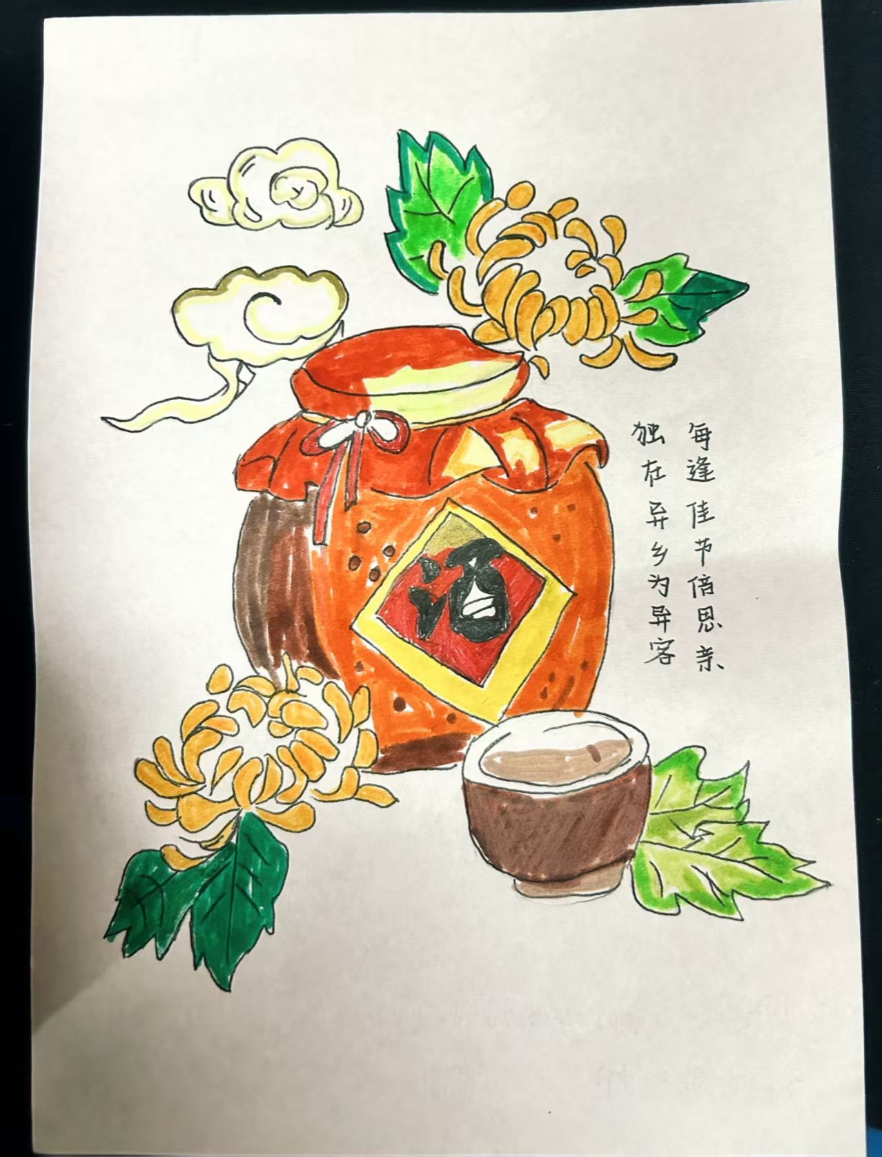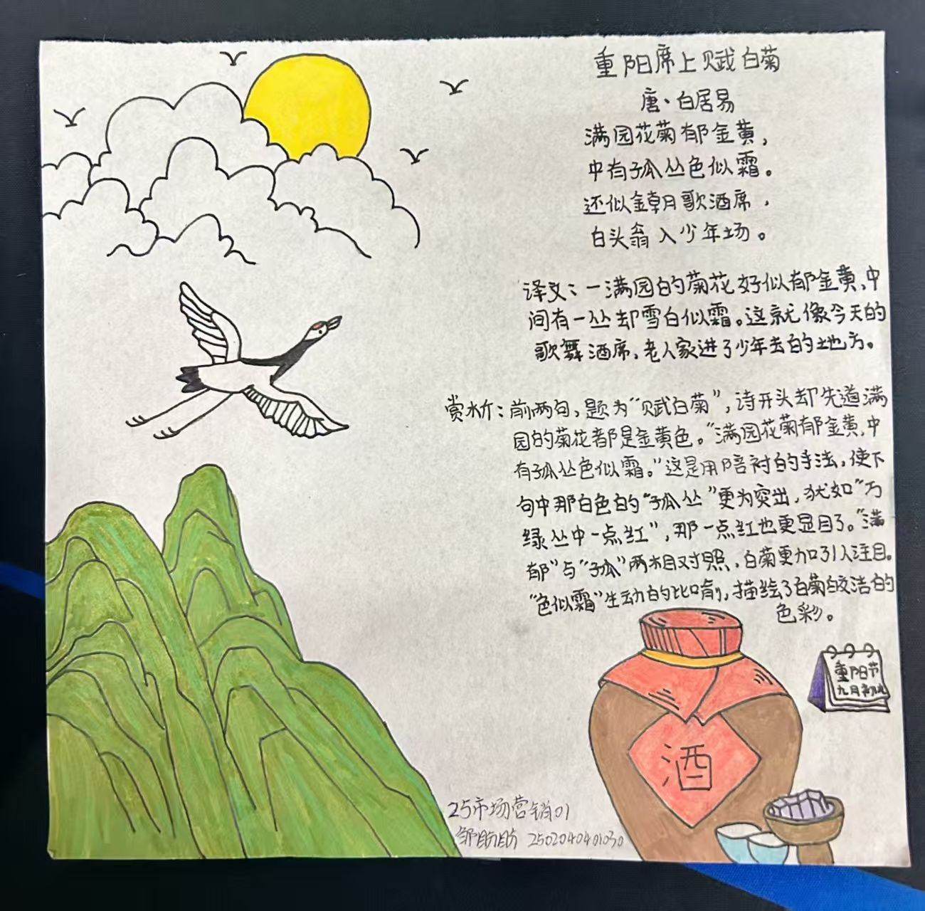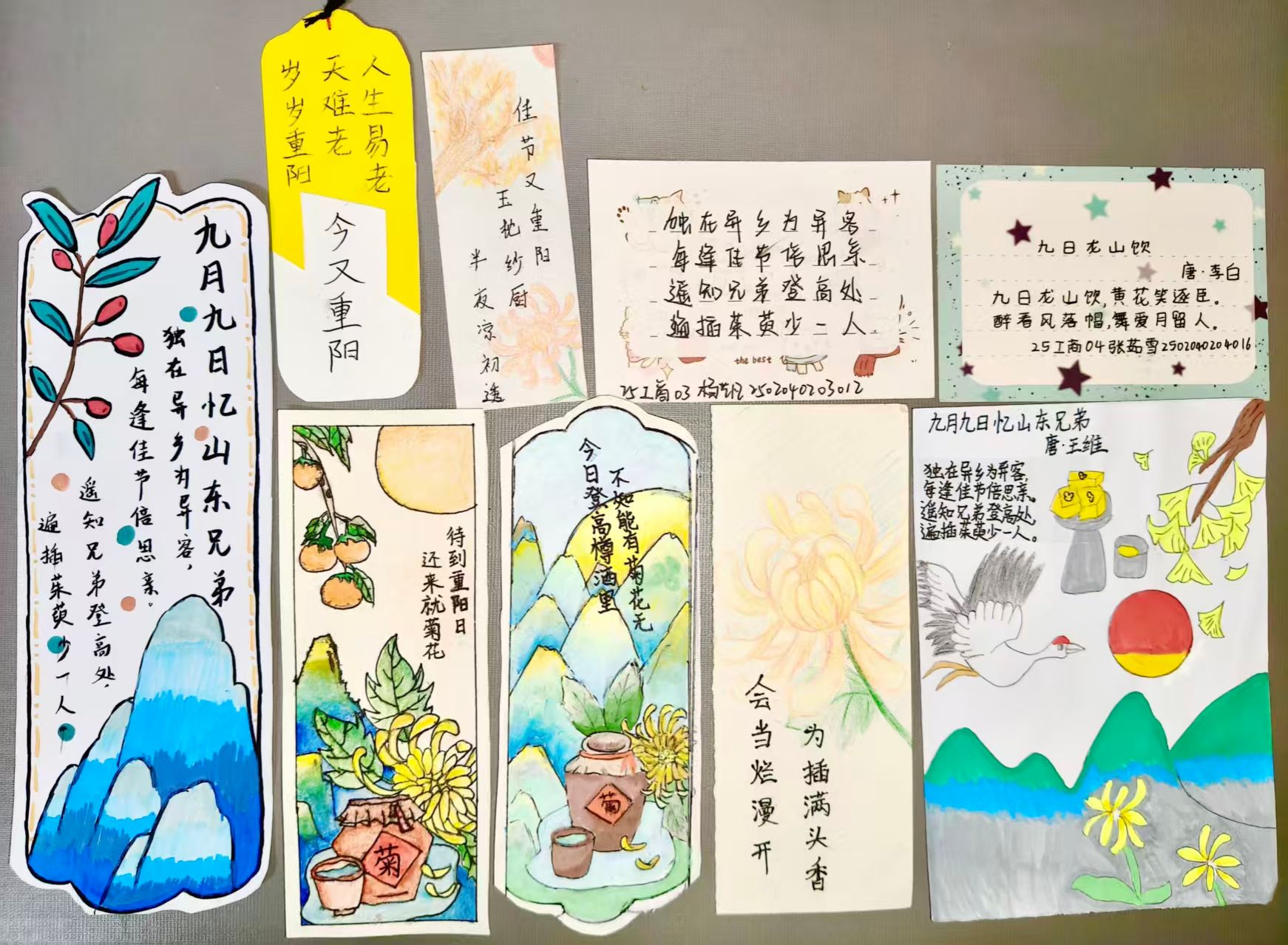 活动期间,同学们热情参与多元文化实践,现场组织有序、氛围热烈。在“诗词创作与赏析”环节,同学们将重阳节所蕴含的尊老敬老、思乡怀远与秋日咏怀之情,凝练于字句之间。大家相互品评佳作,在思想碰撞中深化理解,展现出对传统节日文化内涵的深刻把握与富有时代精神的当代诠释。同时,在“经典诗词书签制作”环节,同学们以纸笔为媒介,精心誊抄《九月九日忆山东兄弟》等重阳经典篇目,并巧妙融入秋菊、远山、茱萸等传统意象进行艺术构思与设计,使方寸书签成为承载隽永诗意的文化载体与美学实践,让古老的传统在当代青年的指尖焕发新的生机与活力。同学们纷纷表示,通过细腻的创作与实践,更真切地感受到了传统节日的温度,未来也会主动成为传统文化的传承者。