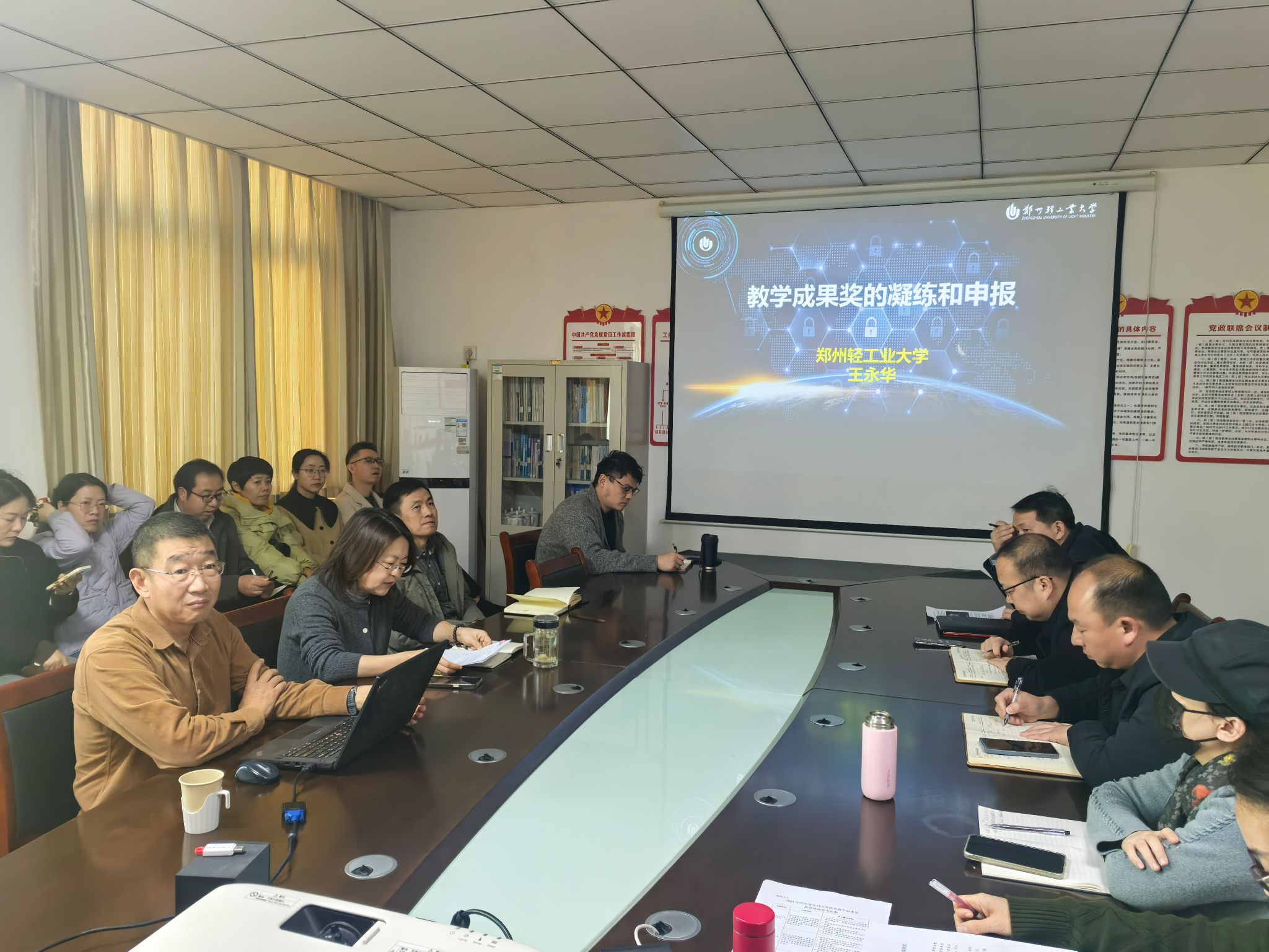 为扎实推进工商管理学院教育教学改革,提升学院高层次教学成果的培育与申报质量,2025年11月28日,工商管理学院特邀国家级领军人才(教学名师)、国家级教学成果二等奖获得者、郑州轻工业大学王永华教授,作了一场题为“教学成果奖的凝练和申报”的专题辅导。本次会议由学院院长何丽娜主持,副院长陈先锋,教研室主任、在研教改课题团队成员及意愿进行教改课题申报者等共三十余人参加会议。