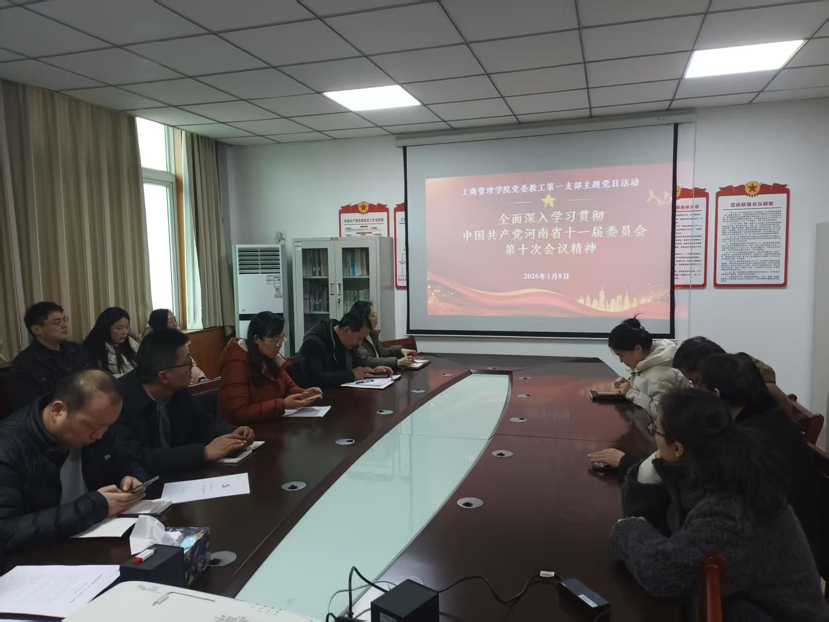 为了深入学习贯彻《中国共产党河南省第十一届委员会第十次全体会议公报》《中共河南省委关于制定河南省国民经济和社会发展第十五个五年规划的建议》精神,1月8日,工商管理学院教工第一党支部开展主题党日活动,全面学习领会会议精神,并结合学院实际工作展开深入交流讨论。