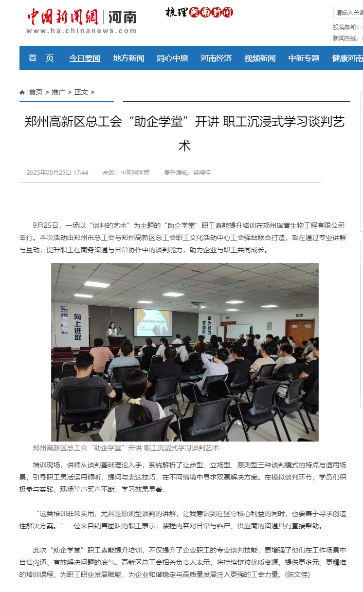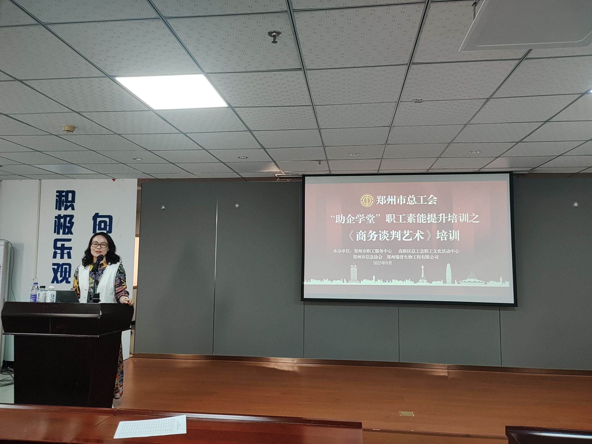 9月25日下午,工商管理学院徐晓飒博士受邀走进郑州瑞普生物工程有限公司,展开了一场“以谈判的艺术”为主题的“助企学堂”职工素能提升培训。此次活动由郑州市总工会与郑州高新区总工会联合打造,旨在通过专业讲解与互动,提升职工在商务沟通与日常协作中的谈判能力,助力企业与职工共同成长。