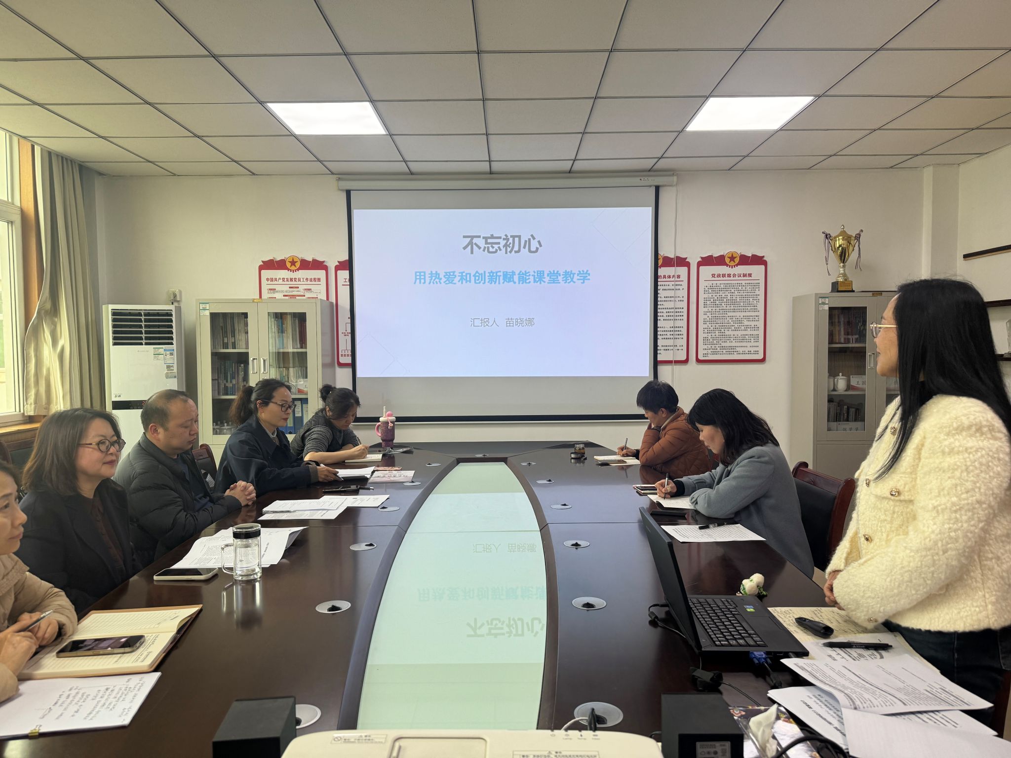 随后,会议进入核心研讨环节。在“教学改革与课堂创新”专题中,苗晓娜副教授分享了其在教学实践中的宝贵经验,并引发现场热烈讨论。与会教师围绕“AI如何赋能课堂教学”这一核心议题,深入探讨了利用人工智能技术重构教学设计、实现个性化学习反馈、模拟复杂管理决策场景的可能性。经过各位老师充分的思想交流与碰撞,教研室初步形成了以“课程场景搭建”“一课一策”等为重点的本学期教学改革方向。